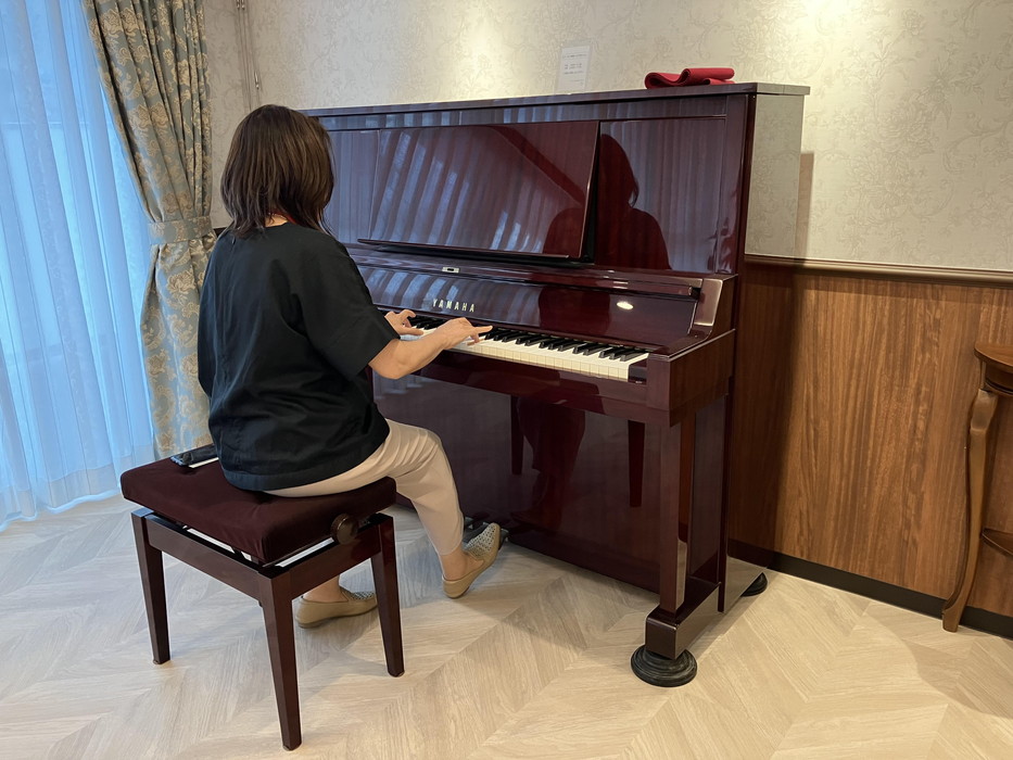 クイーンヒル目白台のラウンジには、1台のピアノがあります。こちらのピアノは、居住者の方からお引越しの際に、ご寄贈いただいたものです。マホガニー色のとても素敵なピアノです。