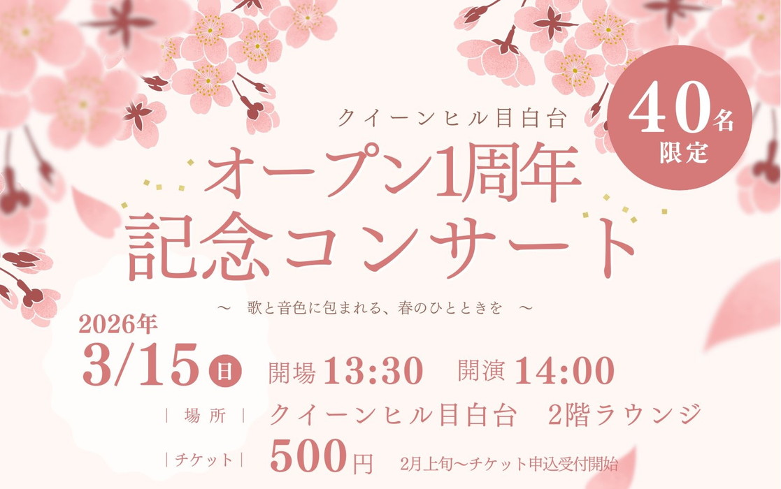 皆さま、こんにちは。おかげさまで、クイーンヒル目白台は2月下旬にオープンから1周年を迎えます。 日頃の感謝の気持ちを込めて、春の訪れを感じる「記念コンサート」と、生活にプラスになるお店が集まる「ふくろ …